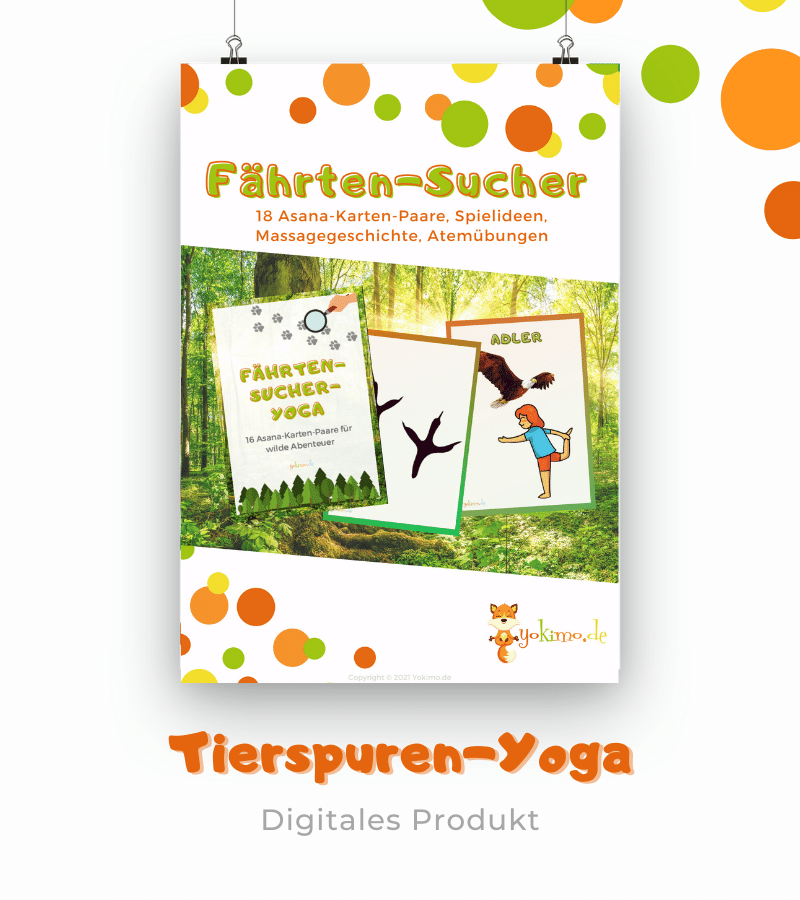 Ein Kinderyoga-Stunden-Set rund um die Spurensuche nach heimischen Tieren inkl. Yoga-Karten, Merkspiel, Massage und Atemübungen.